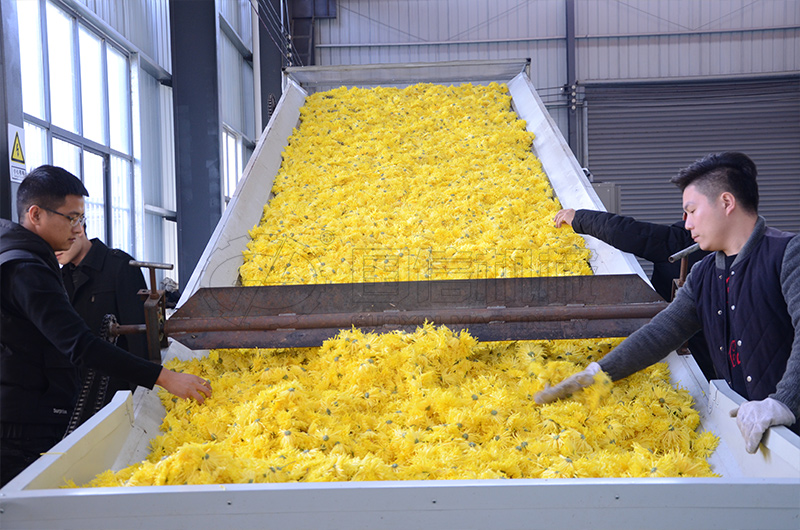 一次烘干的話,菊花外部花瓣可能會焦掉,而中心還是濕的,外焦內(nèi)濕,我們采取分兩步的方法,第一次溫度控制在40-50攝氏度之間,烘掉一部分的水分,然后堆放12小時以上,使花朵內(nèi)外水分均勻再進(jìn)行第二次烘干,第二次烘干的溫度控制在45-50攝氏度之間。