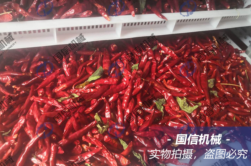 3、二次烘干階段:為保證成品辣椒干貨的品質(zhì),此階段需要辣椒鋪料均勻,堆放不可太厚,保證良好的透氣性,設(shè)置溫度在60~70℃,時(shí)長在6~8個(gè)小時(shí)即可。