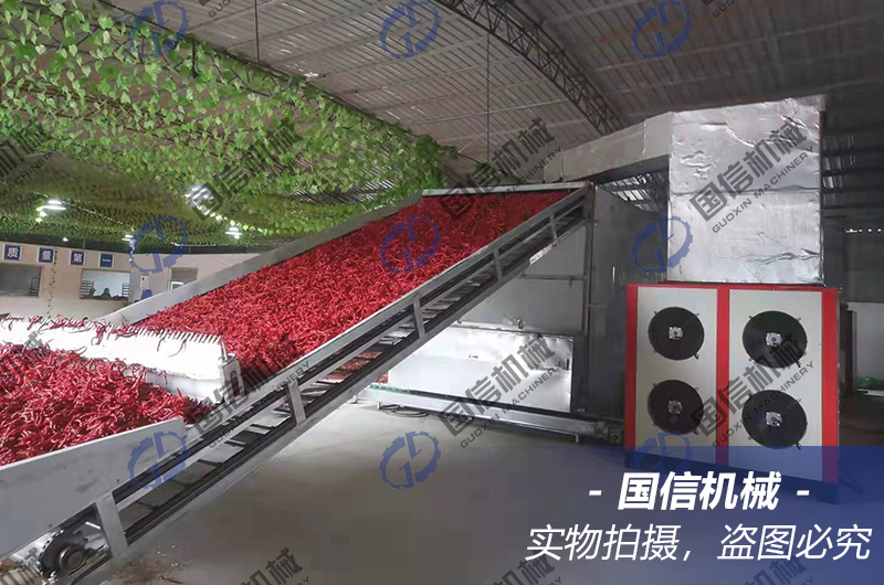 烘干辣椒時,把辣椒鋪在網(wǎng)帶上,辣椒會隨網(wǎng)帶由上到下呈"S"形運轉烘干。同時,熱源產(chǎn)生熱量,在引風機作用下,轉化成為熱風,熱風自下而上垂直穿透不銹鋼網(wǎng)帶辣椒層,對辣椒進行烘干。整個烘干過程中,溫度可根據(jù)需要進行調控,保證辣椒飽滿的果形、鮮艷的色澤、固有的辣素。