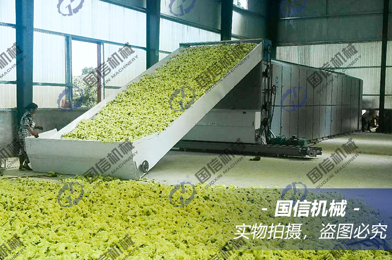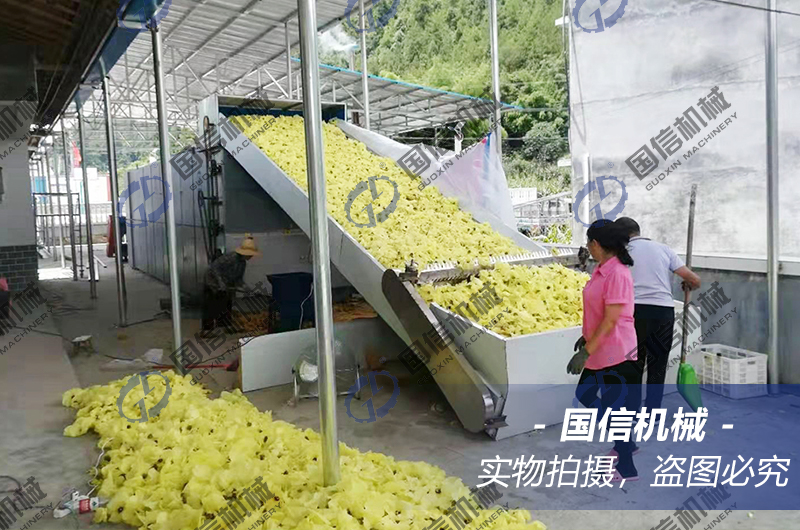 在烘干機內部,黃蜀葵會隨著不銹鋼網(wǎng)帶的“S”形運行方式,多次的緩慢翻轉,于此同時,熱源提供的熱量會從網(wǎng)帶底部,自下而上的傳統(tǒng)黃蜀葵物料層,對其進行烘干作用,帶走花朵中的水分,從頂部排出。