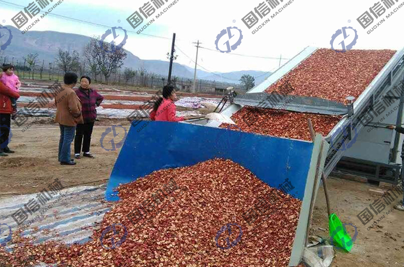 對(duì)于山楂人工晾曬成本高,見(jiàn)效慢,越來(lái)越多種植戶都開始采用烘干機(jī)來(lái)烘干山楂。在試機(jī)的時(shí)候,也吸引來(lái)一些其他農(nóng)戶咨詢、預(yù)定。工作中的上料機(jī)正在將已經(jīng)切好的山楂片傳送到烘干機(jī)中上上層,烘干設(shè)備的另一頭,正源源不斷的輸出烘制好的山楂干片。
